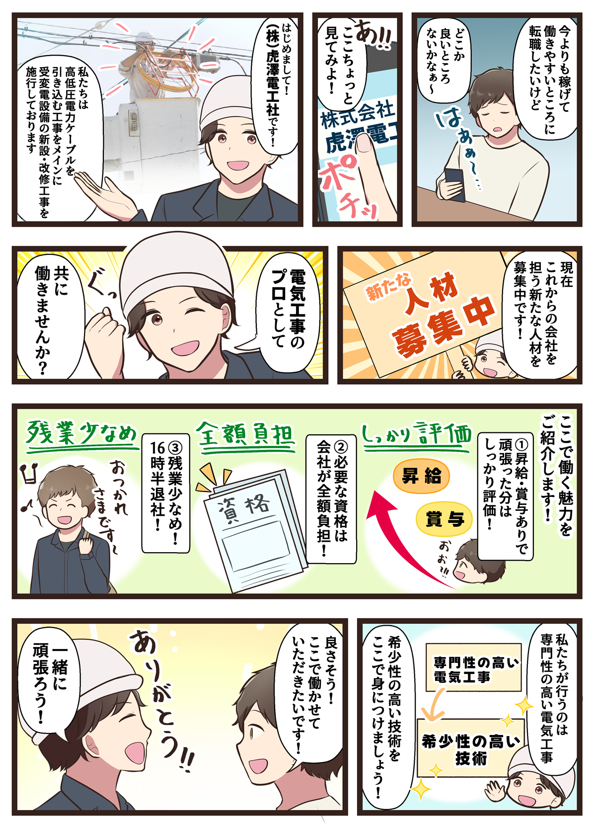 | 必要資格 | 【必須】特にありません! 【歓迎】 ・第二種電気工事士 ・普通自動車免許(AT限定可) ※入社後、費用会社負担で限定解除していただきます。 |